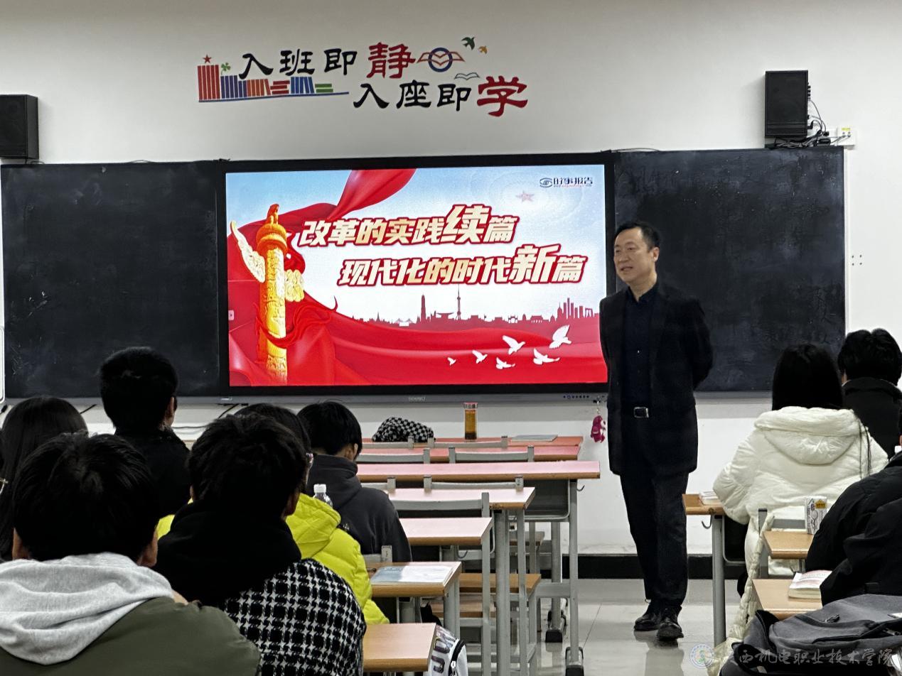 11月22日上午,今年会党委委员、副院长张克在博学楼316教室为23机电技术1、2合班学生上形势与政策课,讲授《改革的实践续篇 现代化的时代新篇》专题内容。