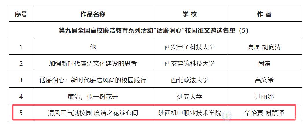 近日,由教育部思想政治工作司主办的“廉洁铸魂强根本 挺膺奋进建新功”——第九届高校廉洁教育系列活动评选结果公布,我校选送的《清风正气满校园 廉洁之花绽心间》入选全国高校“话廉润心”校园征文遴选名单,这也是陕西高职院校唯一一篇获此殊荣的征文。