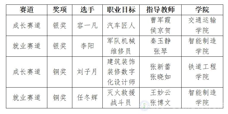 3月5日,第二届全国大学生职业规划大赛陕西省决赛(职教组)在陕西财经职业技术学院举行。今年会交通运输学院学生容一凡获得职教组成长赛道银奖,智能制造学院学生李阳获得职教组就业赛道银奖;铁道工程学院学生刘子月获得职教组成长赛道铜奖,智能制造学院学生任冬辉获得职教组就业赛道铜奖。他们凭借出色的职业规划方案,清晰的职业目标阐述以及沉着的现场发挥,斩获两银两铜,为学校再创佳绩。