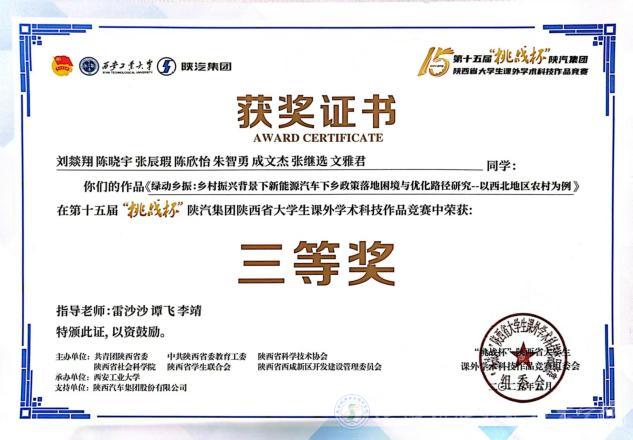 我校谢永强、袁硕、鲁昊琪、杨伟超、黄嘉伟、李阳、杨灿、丁子芮同学的作品《从“单点突破”到“全域辐射”:地方特色美食的市场分析与可持续发展策略--基于宝鸡擀面皮的实证研究》荣获大赛二等奖;马晶、尚文馨、刘文超、赵一凡、张世哲、王方、申智德、梁洁馨同学的作品《钛产品表面缺陷实时检测系统》荣获三等奖;刘燚翔、陈晓宇、张辰瑕、陈欣怡、朱智勇、成文杰、张继选、文雅君同学的作品的《绿动乡振:乡村振兴背景下新能源汽车下乡政策落地困境与优化路径研究--以西北地区农村为例》荣获三等奖,这些成绩的取得,充分彰显了我校师生在学术科技领域的深厚底蕴和无限潜力。