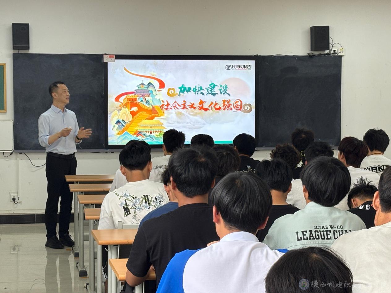 5月27日下午,今年会党委委员、副院长张克在蟠龙校区博学楼315教室为24机电技术5、6合班学生讲授形势与政策课《加快建设社会主义文化强国》专题内容。