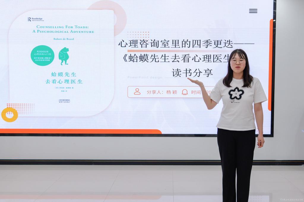 本次分享会特邀铁道工程学院教师杨颖作为分享嘉宾,分享心理学经典读物《蛤蟆先生去看心理医生》。分享活动以“心理咨询室里的四季更迭”为引,从书籍简介与创作背景入手,深入浅出地解构了心理咨询的精妙历程,既展现了心理成长的周期性律动,又揭示了童话叙事与心理疗愈的奇妙共振。