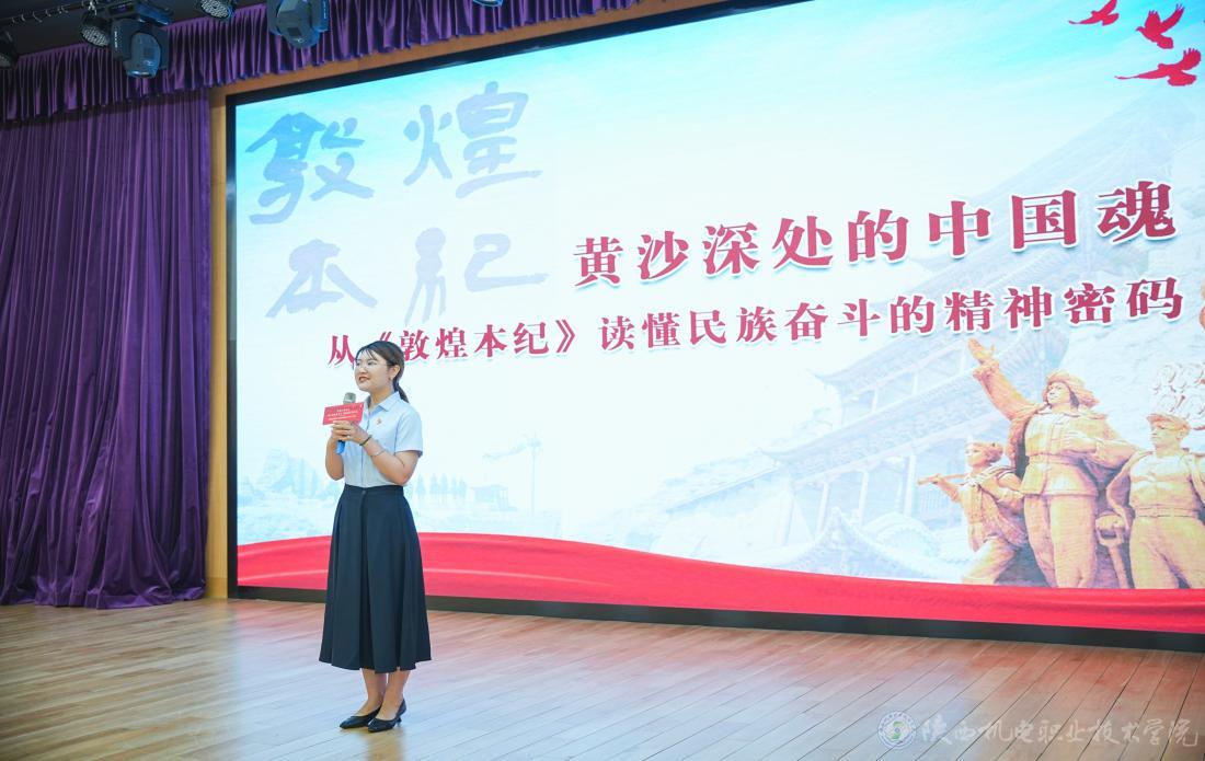 谈及“劳动美”,她引用书中“沙州城的魂,是拿命一寸寸夯出来的”,讲述胡恩可开仓赈灾、二十三坊少年挽臂护城的壮举,诠释劳动从谋生到“以生命守护信仰”的升华;而当讲到“跟党走,魂铸新征程”时,她将书中胡梵义护经传文的热血与1944年常书鸿在党旗下建立敦煌研究所的历史相呼应,点明“唯有紧跟党的旗帜,民族魂魄方能生生不息”的深刻内涵。