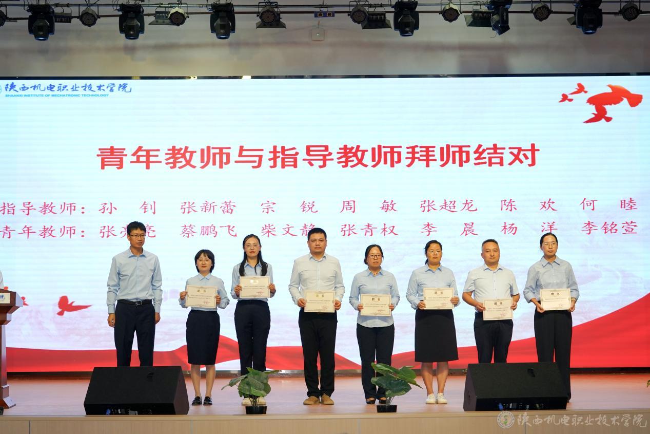 青年教师与指导教师拜师结对。李明为指导教师颁发证书,青年教师向指导教师献花。