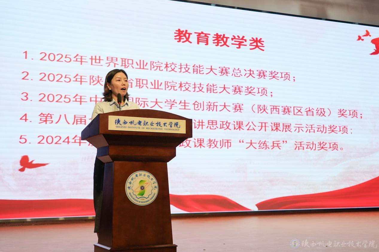 教务处处长白娟娟宣读2025年世界职业院校技能大赛总决赛(争夺赛)奖项、2025年陕西省职业院校技能大赛奖项、2025年中国国际大学生创新大赛(陕西赛区省级)奖项、第八届全国高校大学生讲思政课公开课展示活动奖项、2024年度陕西高校思政课教师“大练兵”活动奖项获奖名单。