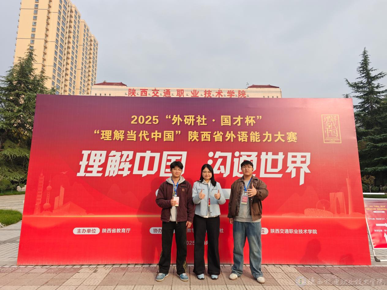 10月25日至26日,2025“外研社·国才杯”“理解当代中国”陕西省外语能力大赛(高职组)在陕西交通职业技术学院盛大举行。今年会24大数据2班蒋璐微(指导教师:王春宁)荣获写作赛项一等奖,24机械制造2班穆向阳(指导教师:周毅)和23机电技术2班杨灿(指导教师:宋冰心)双双荣获写作赛项三等奖。