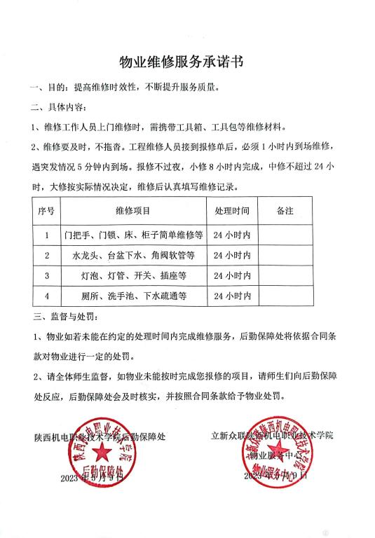 致广大师生——后勤保障处物业维修服务承诺