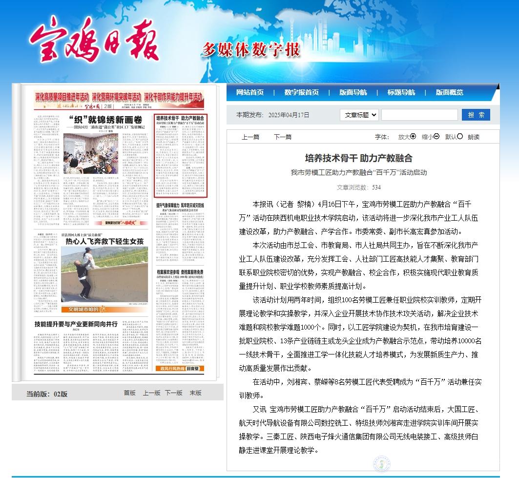 又讯 宝鸡市劳模工匠助力产教融合“百千万”启动活动结束后,大国工匠、航天时代导航设备有限公司数控铣工、特级技师刘湘宾走进学院实训车间开展实操教学。三秦工匠、陕西电子烽火通信集团有限公司无线电装接工、高级技师白静走进课堂开展理论教学。(宝鸡日报记者 黎楠)