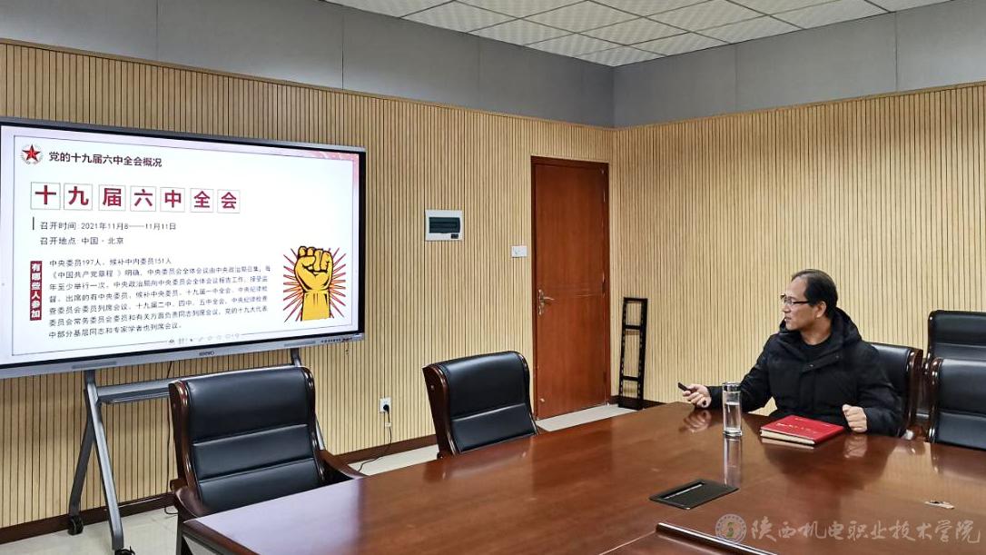 党的十九届六中全会是在建党百年之际,在重要历史关头召开的一次具有重大历史意义的会议,会议主题鲜明、思想深邃、高屋建瓴、博大精深。为深入学习贯彻党的十九届六中全会精神,深刻领会全会精神的丰富内涵和核心要义,积极引导支部党员从百年党史中汲取智慧和力量。2021年12月23日,党委书记伊逊智在蟠龙校区图书馆二楼会议室为行政党支部、发展规划处党支部讲授专题党课,题为《解读党的十九届六中全会精神》。