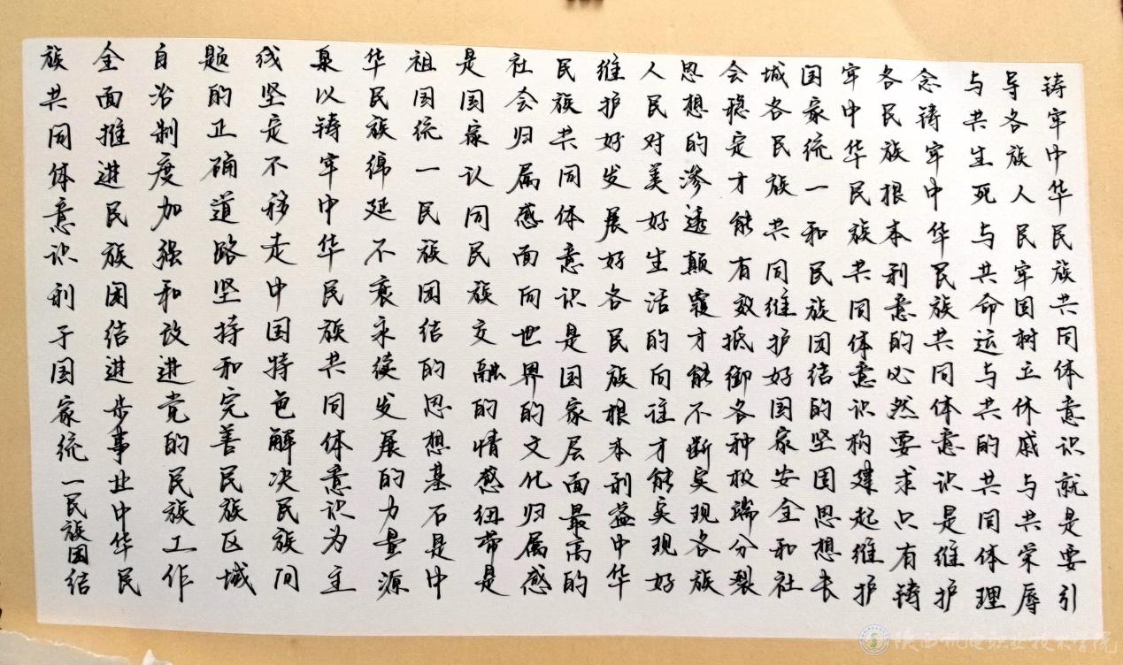 为进一步贯彻落实中省民族工作会议精神,营造学校民族团结的良好氛围,深刻理解习近平总书记关于加强和改进民族工作的重要思想和关于建设教育强国的重要讲话精神,根据《中共今年会委员会关于开展铸牢中华民族共同体意识系列活动的通知》,基础部党支部委员会于2023年11月在全校范围内开展了“培根育魂,石榴花开”主题系列活动。活动分为征文、书法绘画、摄影、剪纸、趣味篮球、定向运动等六项,共收到师生征文7篇,书画作品35幅,照片21张,剪纸作品39张。