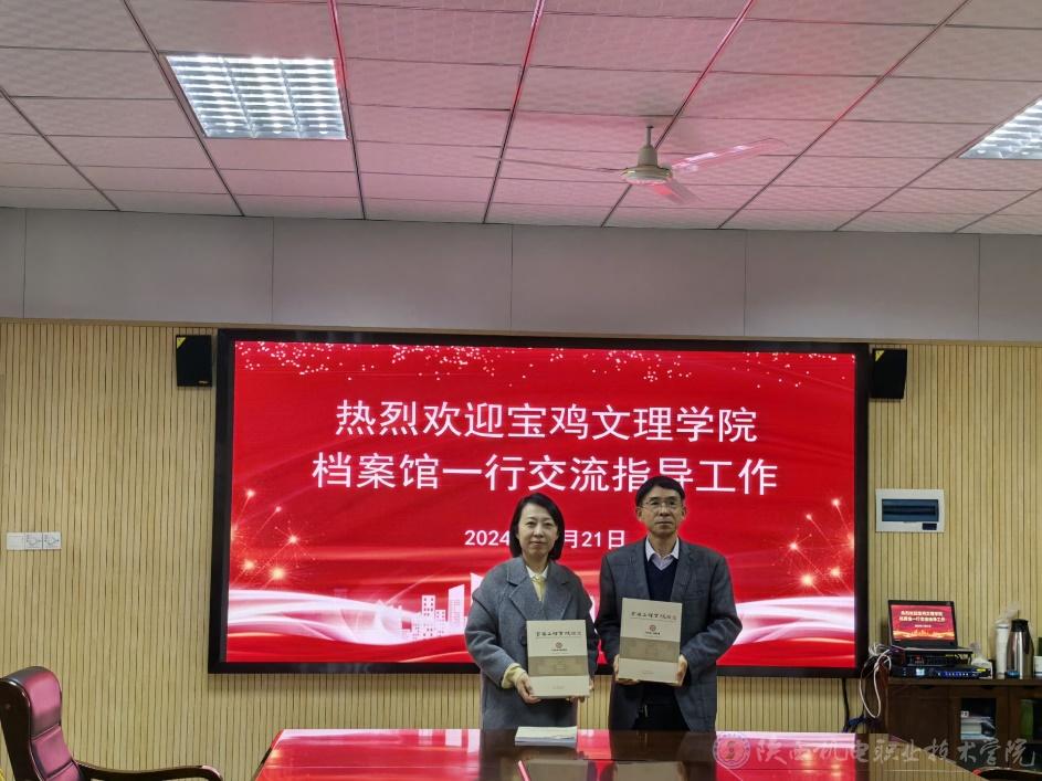 随后,李建峰将《宝鸡文理学院校史1958—2022》《宝鸡文理学院档案工作规章制度汇编》赠予我校,这为我校在校史编研、制度修订方面提供了极大的借鉴意义。