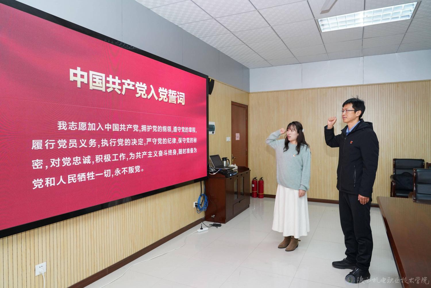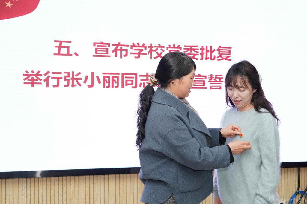 会议严格按照组织程序,李明同志宣读学校党委《关于同意接收张小丽同志为中共预备党员的批复》,王芙蓉同志为张小丽同志佩戴党员徽章。在李明同志领誓下,张小丽同志面向党旗庄严宣誓,铿锵誓言彰显其听党话、跟党走的坚定信念和使命担当。